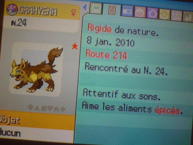 Route 214, vannée par le recherche d'un Ponyta shiney obtenu après une chaîne de 32le premier septembre, Hikari (moi) cherche le Pomon initial qu'elle voulait : Grahyéna. Au soir du huit janvier, épuisée par certains évènements de la journée et malade, Hikari reprend sa version Diamant et commence une chaîne de Grahyéna. Au bout de 66 Grahyéna, elle trouve celui qu'elle cherchait, son Grahyéna Shiney de couleur or-orange.